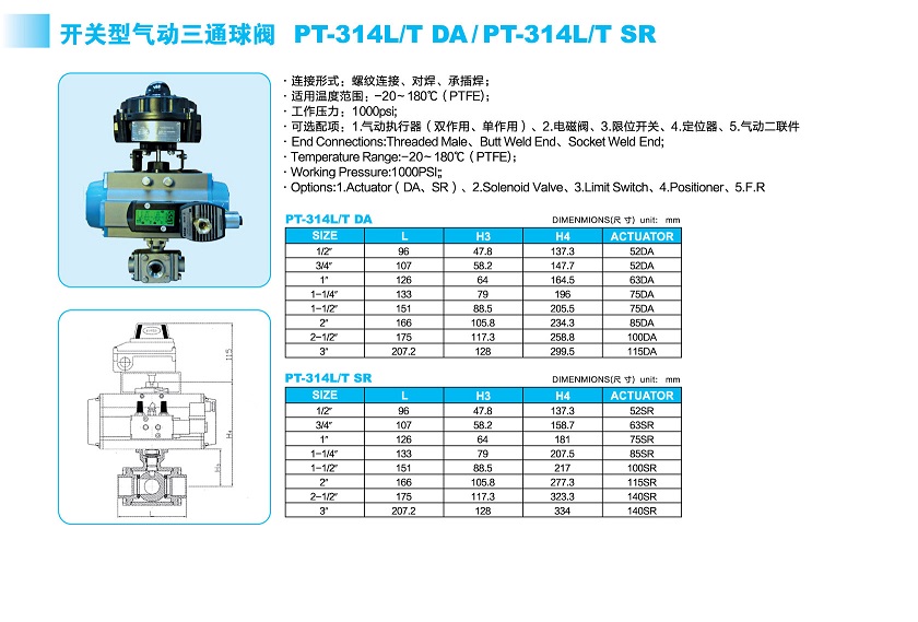 开关型气动三通球阀 PT-314L/T DA/PT-314L/T SR